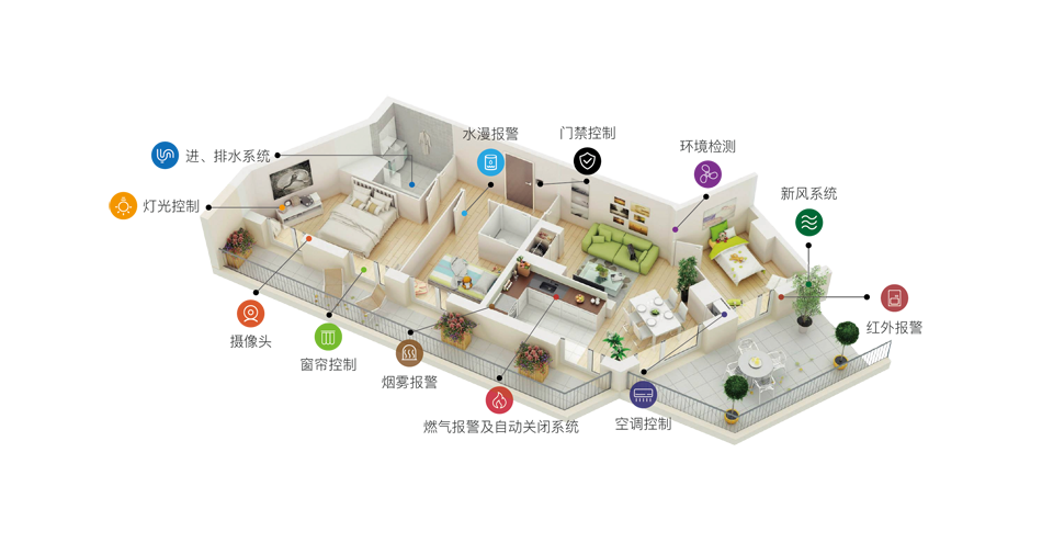 构建包括智能控制中心、智能安防系统、智能照明系统、暖通环境系统、能